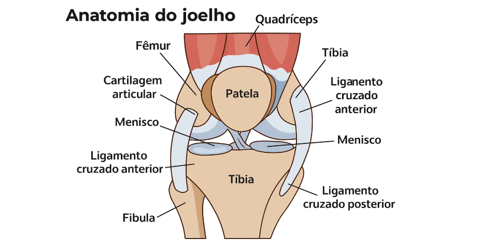 A anatomia do joelho envolve várias estruturas que se articulam para possibilitar movimento, estabilidade e absorção de cargas. Os elementos principais são: