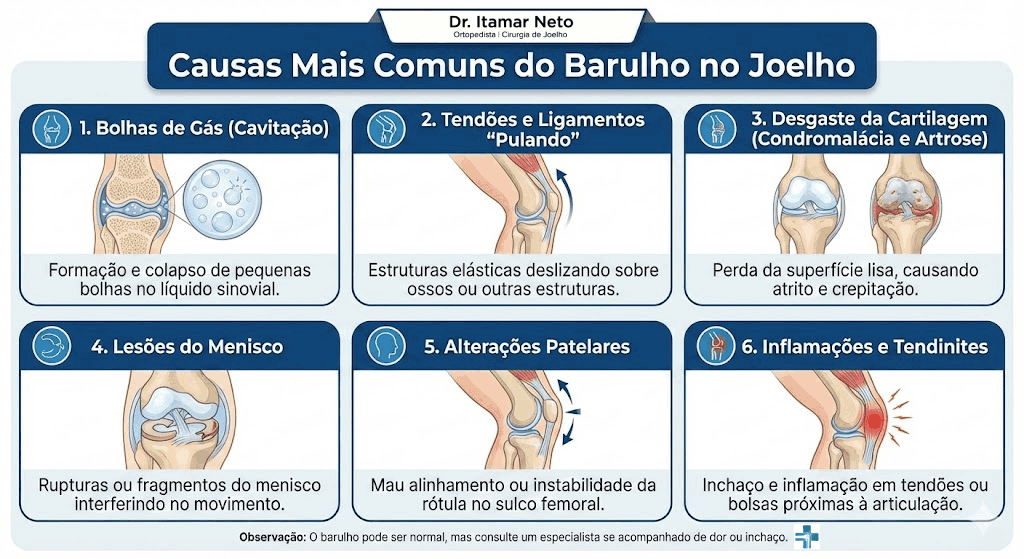 Na maioria dos casos, são benignos e inofensivos. O som é causado pelo rompimento de bolhas de gás (nitrogênio) que se formam no líquido sinovial (o "lubrificante" natural da articulação), ou pelo movimento/atrito dos tendões ao passarem sobre proeminências ósseas durante a flexão e extensão do joelho.
