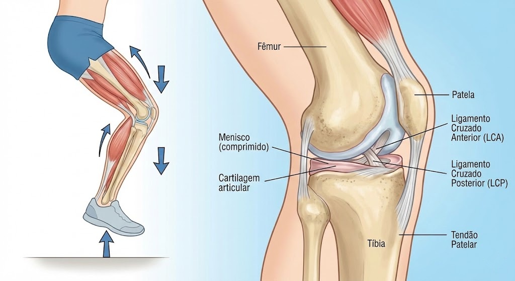 O joelho não absorve impacto sozinho. Ele faz parte de um sistema integrado que envolve ossos, cartilagens, músculos, ligamentos e tendões. Durante o impacto com o solo, especialmente em atividades como corrida e salto, forças que podem ultrapassar várias vezes o peso corporal são geradas.